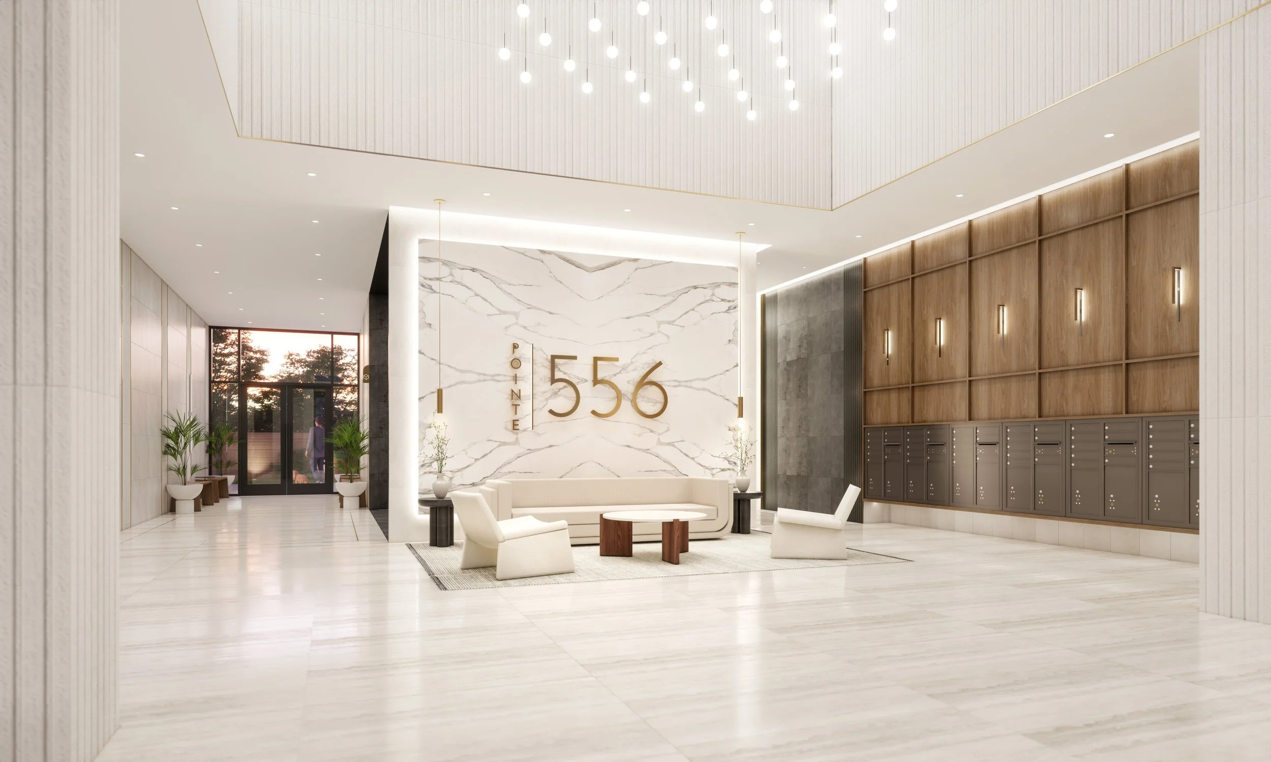 The spacious and modern lobby is furnished with comfortable seating, perfect for lounging. The mail is located right next to this seating area, with a separate package room closeby.